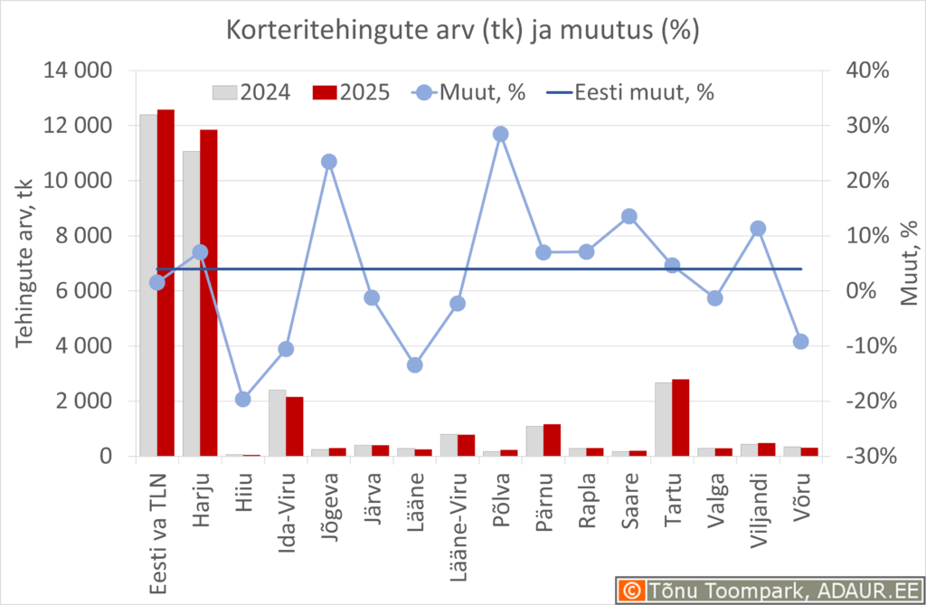 Kõige suurem korteritehingute arvu kasv oli Põlva maakonnas, kus 2025. a tehingute arv 230 oli 29% aastatagusest suurem.