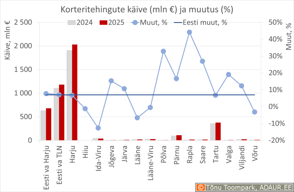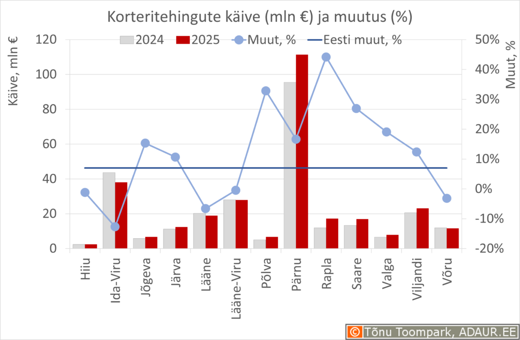 Kõige enam suurenes korteritehingute rahaline käive Rapla ja Põlva maakondades, kus 2025. a tehti korteritehinguid vastavalt 17,3 ja 6,8 miljoni euro väärtuses. Aastane käibekasv Raplamaal ja Põlvamaal oli vastavalt 44 ja 33%.