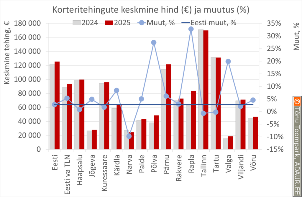 Maa- ja ruumiameti andmetel sõlmiti 2025. a Eestis 21 562 korteritehingut, millede keskmine hind oli ~125 000 eurot ehk aasta varasemast 2,8% rohkem. Maakonnakeskuste vaatest olid Eesti keskmisest suurema hinnaga tehingud ainult Tallinna ja Tartu linnades.