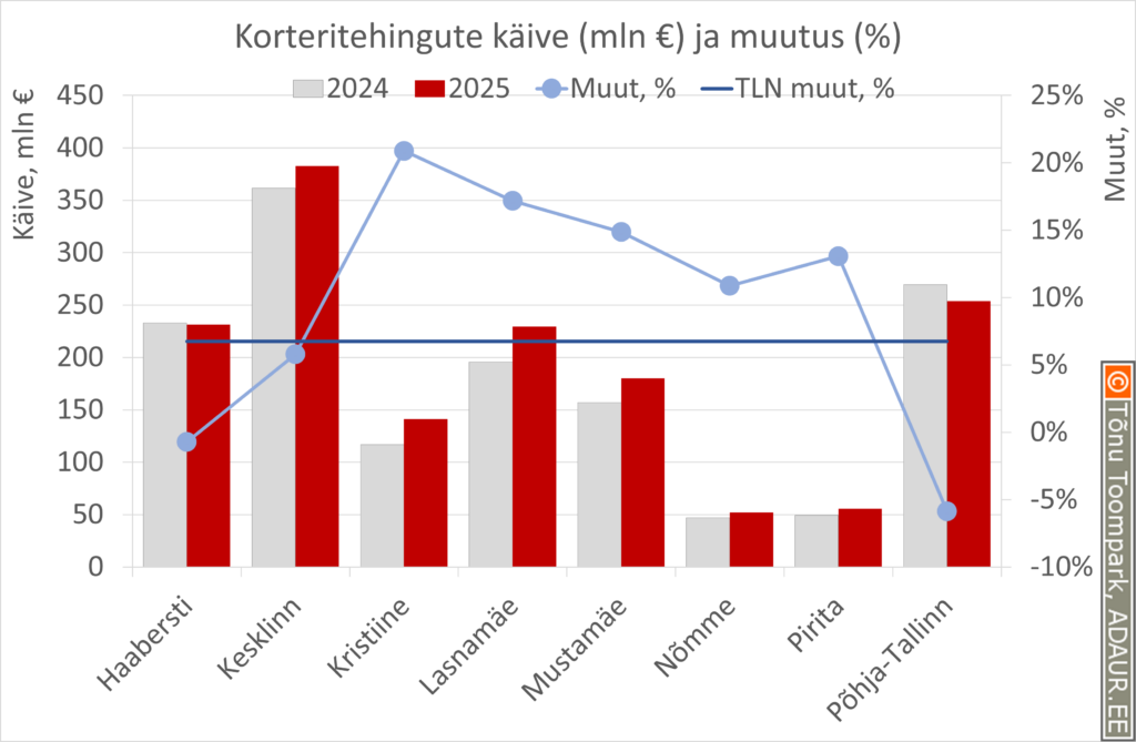 Korteritehingute 2025. a rahaline käive suurenes kõikides Tallinna linnaosades peale Haabersti ja Põhja-Tallinna. Haabrstis jäi korterite käivet aastaga 0,6 ja Põhja-Tallinnas 5,1%, Tehingukäibe vähenemise tagamaa on vähem uusarenduste asjaõiguslepinguid.