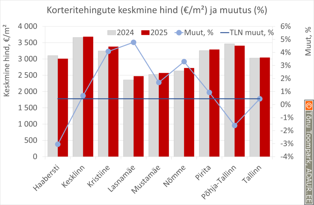 Hinnatõusu tipp 2025. a korteritehingnutes oli Lasnamäel. Lasnamäe korteritehingute keskmine hind 2472 €/m² ületas aasta varasemat 4,8%.